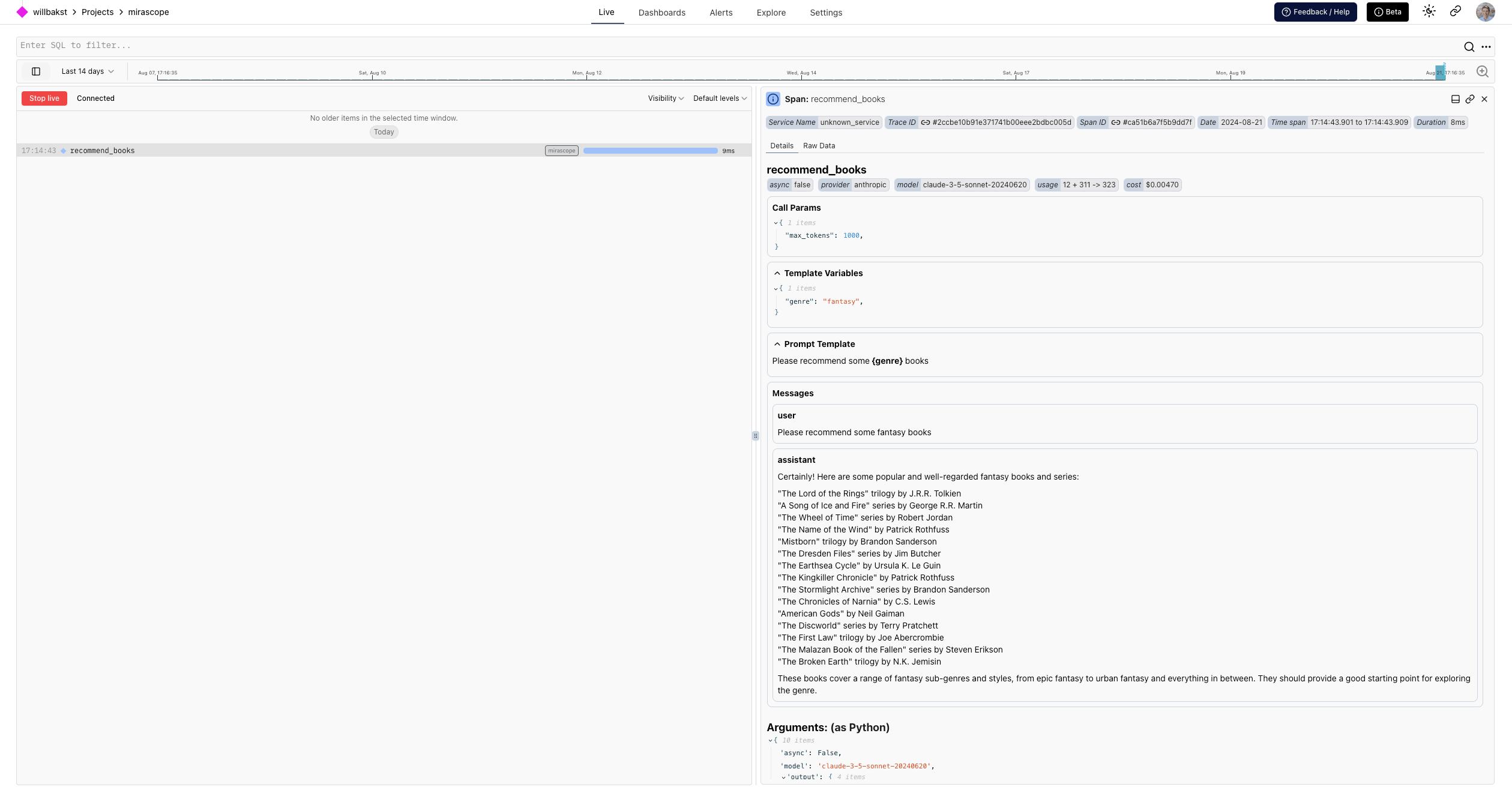 recommend_booksthat captures items like the prompt template, templating properties and fields, and input/output attributes - Human-readable display of the conversation with the agent